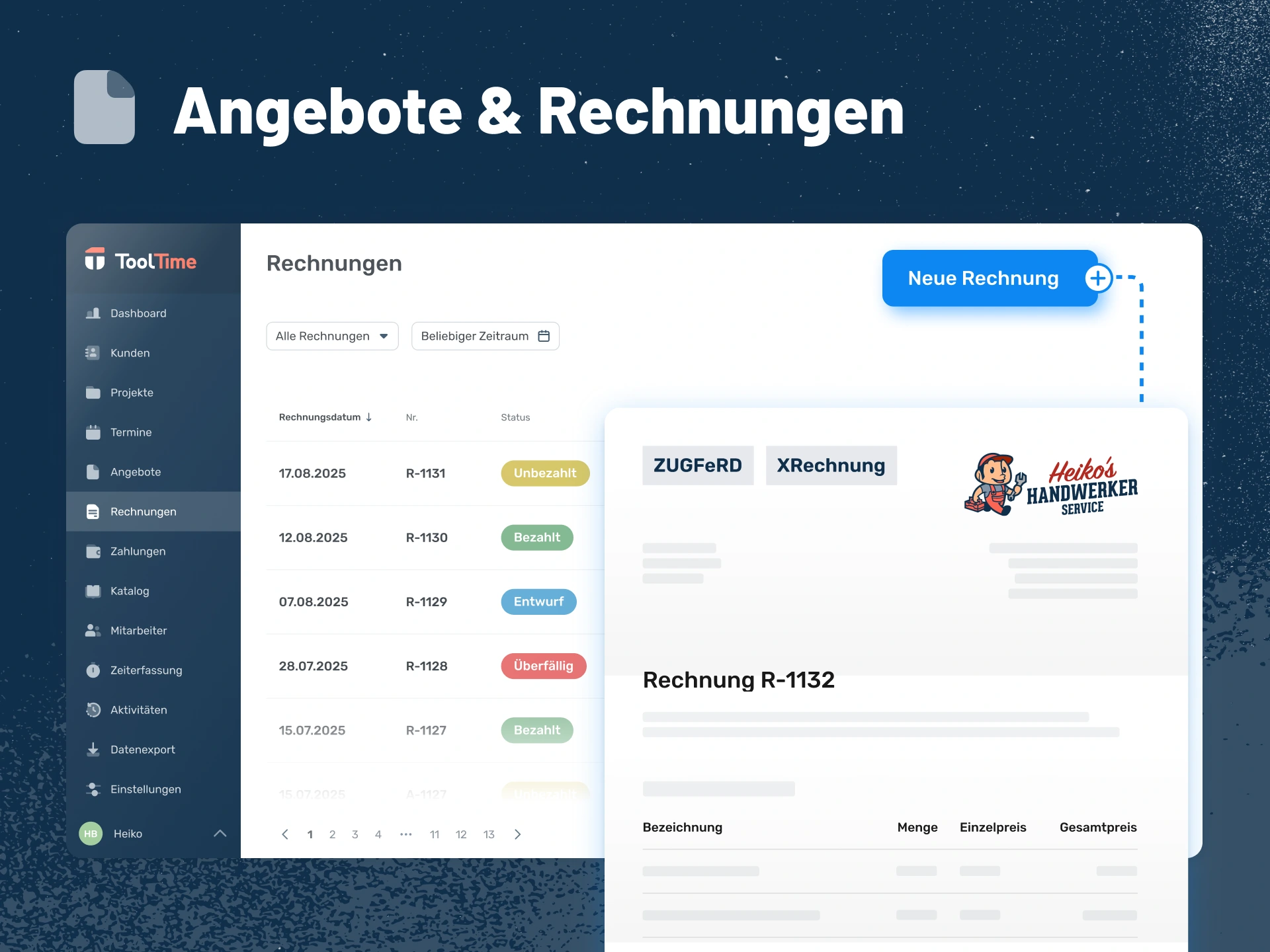 Mit ToolTime läuft Dein Büroalltag im Handwerk digital, einfach und effizient – vom Angebot über die Zeiterfassung bis zur fertigen Rechnung. Mehr als 20.000 Handwerker arbeiten bereits mit der Software – und sparen dabei jede Menge Zeit und Nerven.