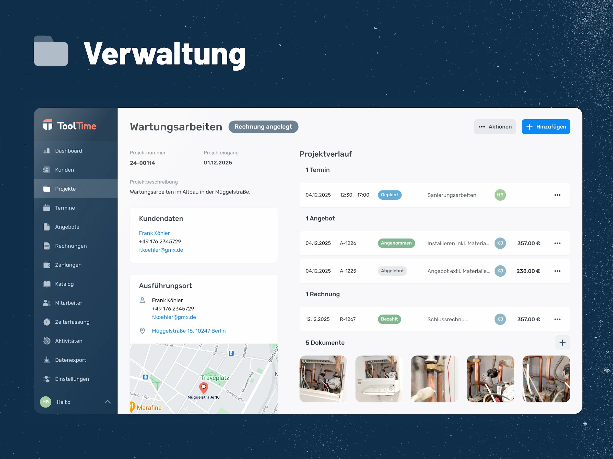 - Projekt- und Kundenverwaltung: Alle Informationen gebündelt an einem Ort – digital, übersichtlich und jederzeit verfügbar.